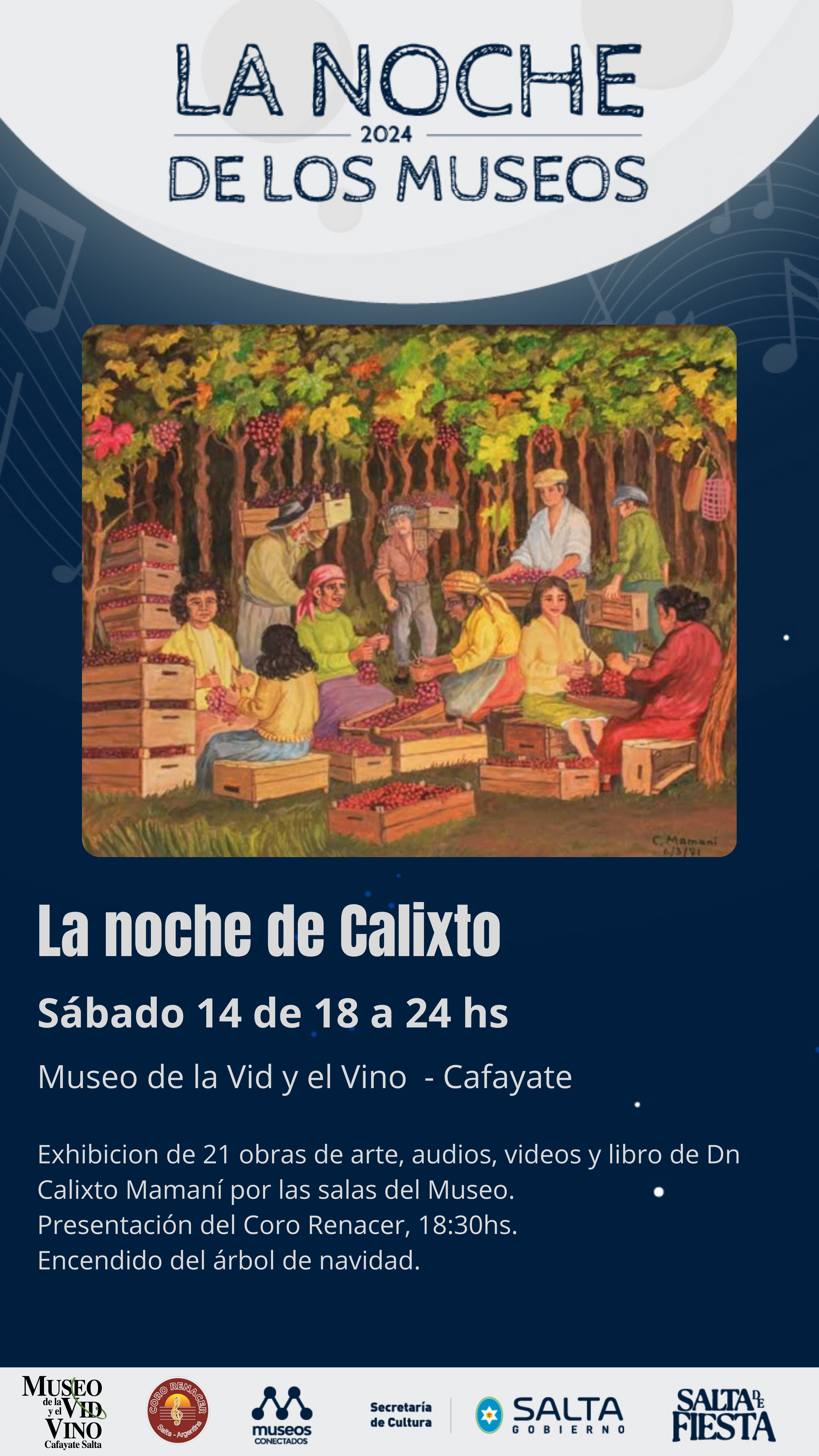 Este año las salas se convertirán en un espacio de exhibición de obras de arte, donde estarán presentes 21 obras de Dn Calixto Transito Mamaní, con imágenes del documental de Coquena producciones de Gonzalo "Pigua" Cristofani, la entrevista de El Atraparadios de Sacha Haro Galli y el libro Calixto Mamaní“El Hombre del Castillo” de Josefina Carón. Una noche peculiar del artista plástico cafayateño que dejó un gran legado al Valle Calchaquí. El sábado 14 de diciembre de 18 a 24hs.
